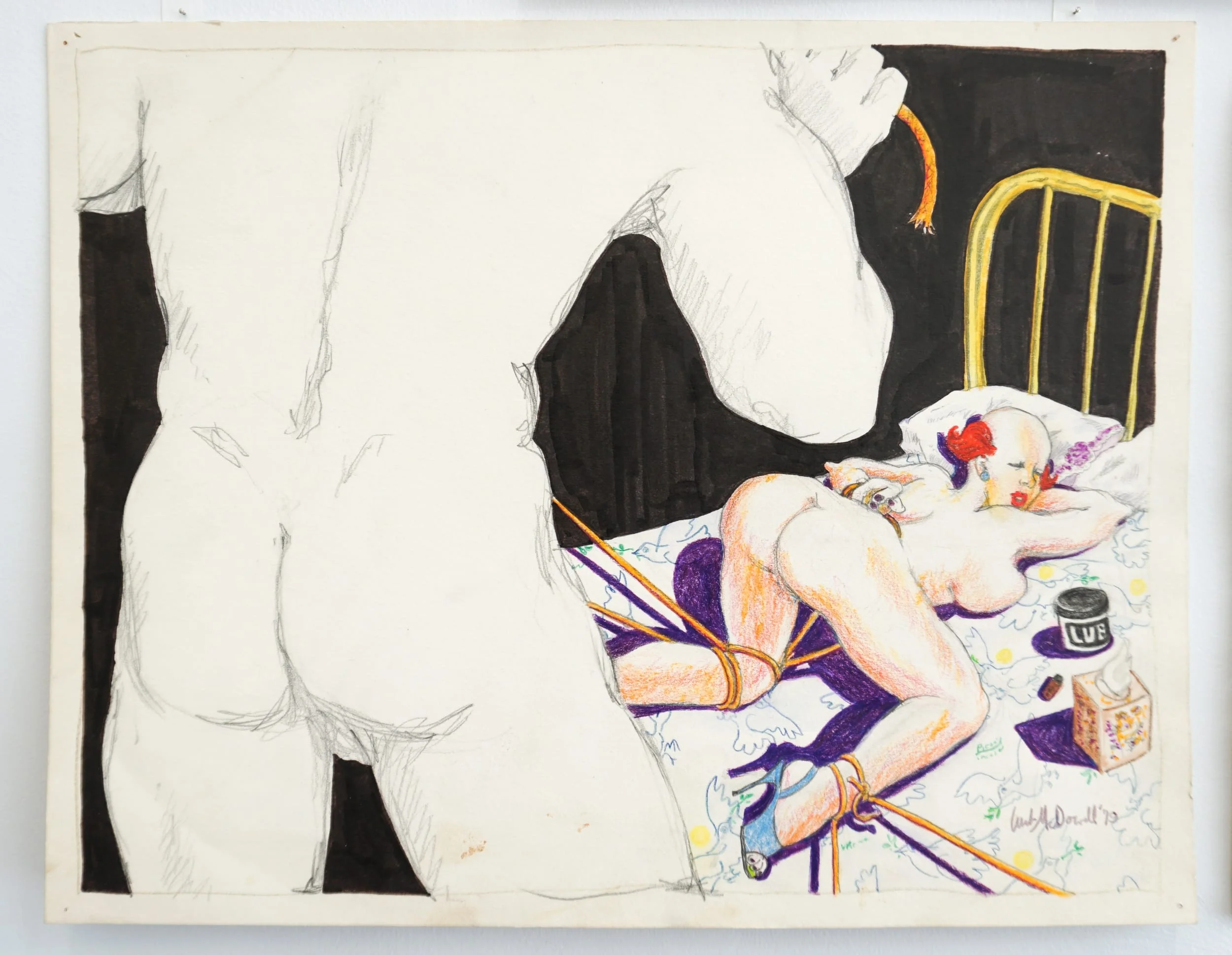Curt was constantly drawing, always had a notebook on hand, says the late George Kuchar & his brother Mike; in between his cinematic making (over 35 films), McDowell produced a staggering number of drawings, photo collages, watercolors, posters for films, diorama style film sets, and elaborate Zip-A-Tone comics—all storyboards of sorts—the byproduct of regularly held Tuesday night art parties with The Roxie Theater family of friends. Reflecting the candor of McDowell’s sexual films, this graphic output captures the intimacy of his ever evolving and deeply rooted social circle in what would be a secondary and yet immediate practice.