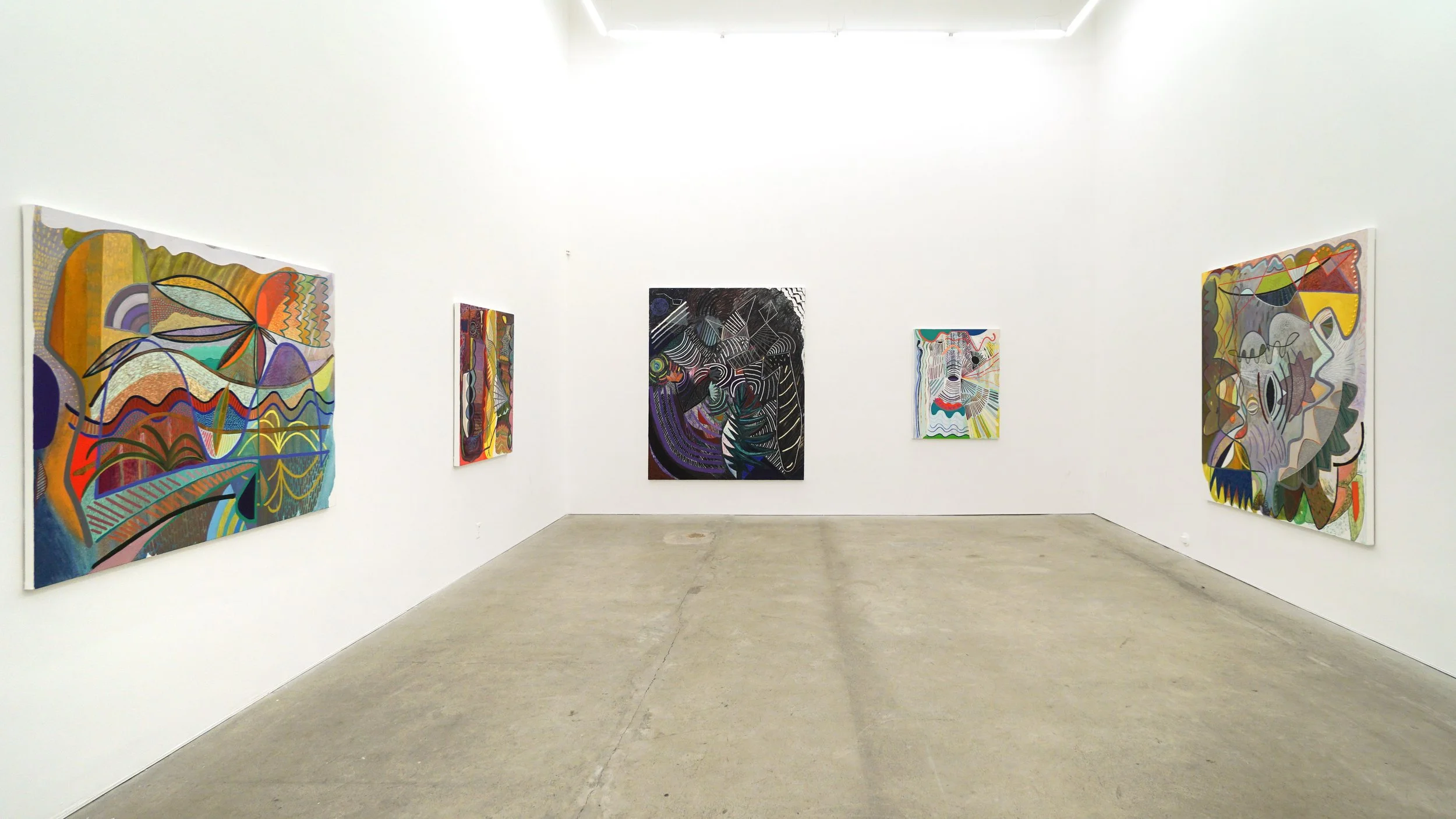 Karla Wozniak’s new paintings are filled with a playful complexity. The paintings exist on the edge of representation: a line becomes a string, a net, a contour, a sound wave, moving from a single gesture to carefully sculpted paint rising from the surface of the canvas. Color is formal and representative, and symbols and marks interweave to create a visual world that suggests a kind of synesthetic experience. Like the phenomenon of a sunshower, in which rain falls when the sun is shining, the work presents viewers with a superabundance of material that is at once contradictory and harmonic.