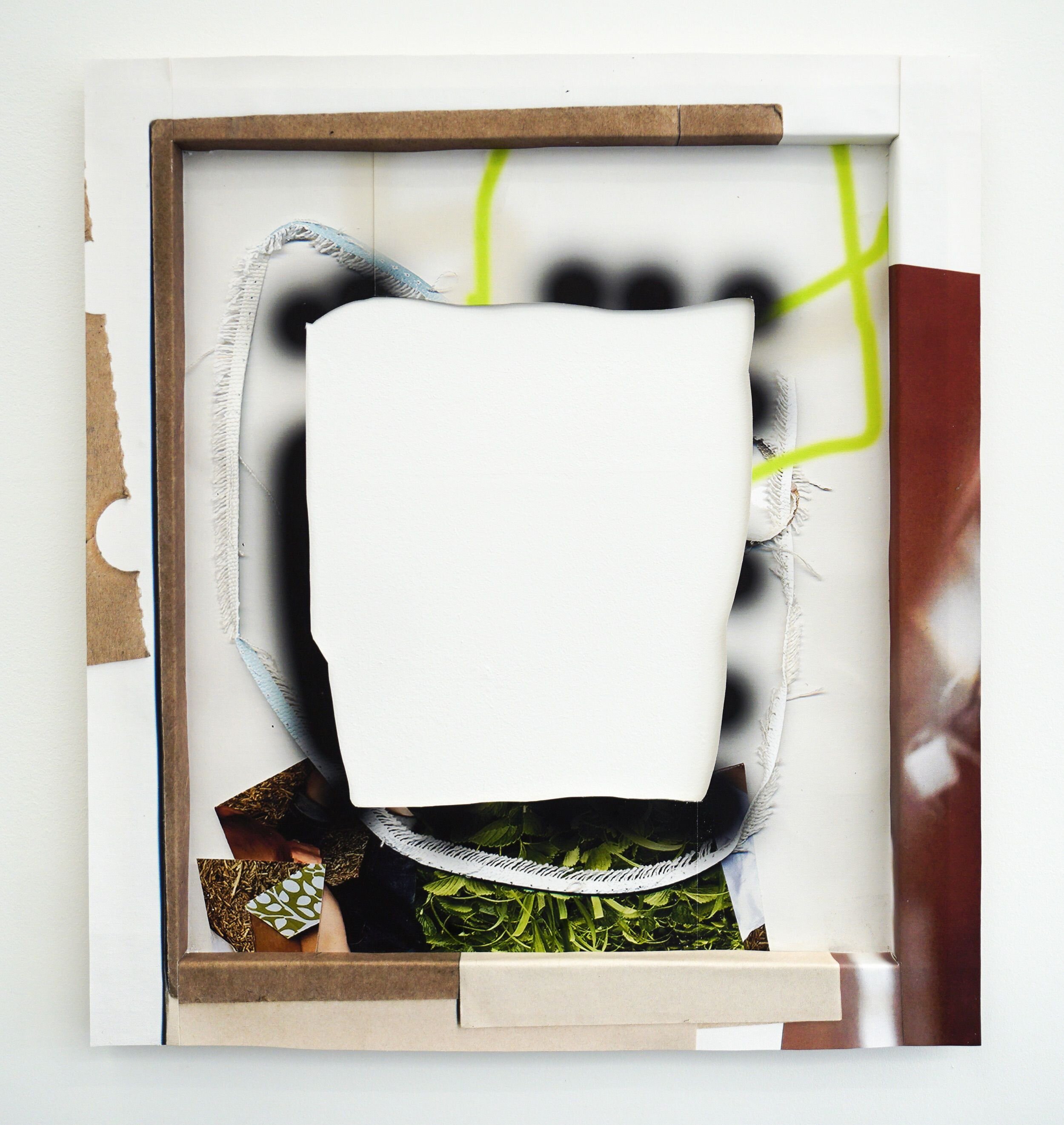 These paintings fold in on themselves to protect, they fold back on themselves as they attempt to reconstruct. These paintings guard their own inner reality. Cutouts in the images betray an inner confusion and chaos. The layered images depict second guesses.